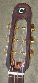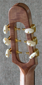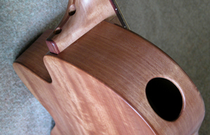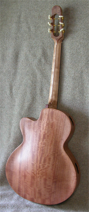 An archtop guitar with curly makore body and curly redwood top. Designed for a full sound without amplification, it has great clarity and separation. Trim is camatillo rosewood.