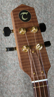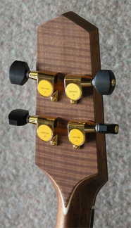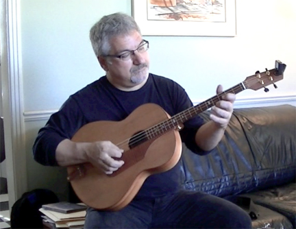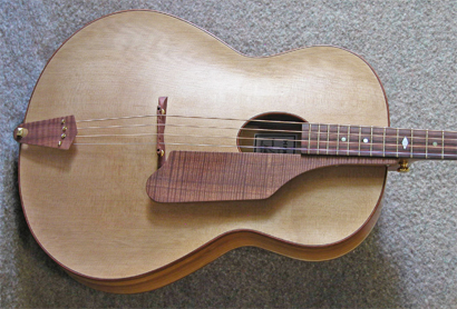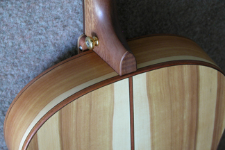 An Irish tenor guitar (tuned GDAE) with juniper body and Western red cedar top. Trim is a variety of red woods with black veneer edges. Scale is 540 mm or 21 1/4" for easy fretting. All my usual features like removeable/adjustable neck and internal carbon fiber compression brace. The thin neck is easy to play, and very light construction gives a rich ringing tone, good for any style (as long as you don't tremolo).